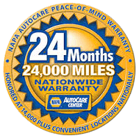 The NAPA AutoCare Peace of Mind Warranty covers parts and labor on qualifying repairs and services for 24 months/24,000 miles.